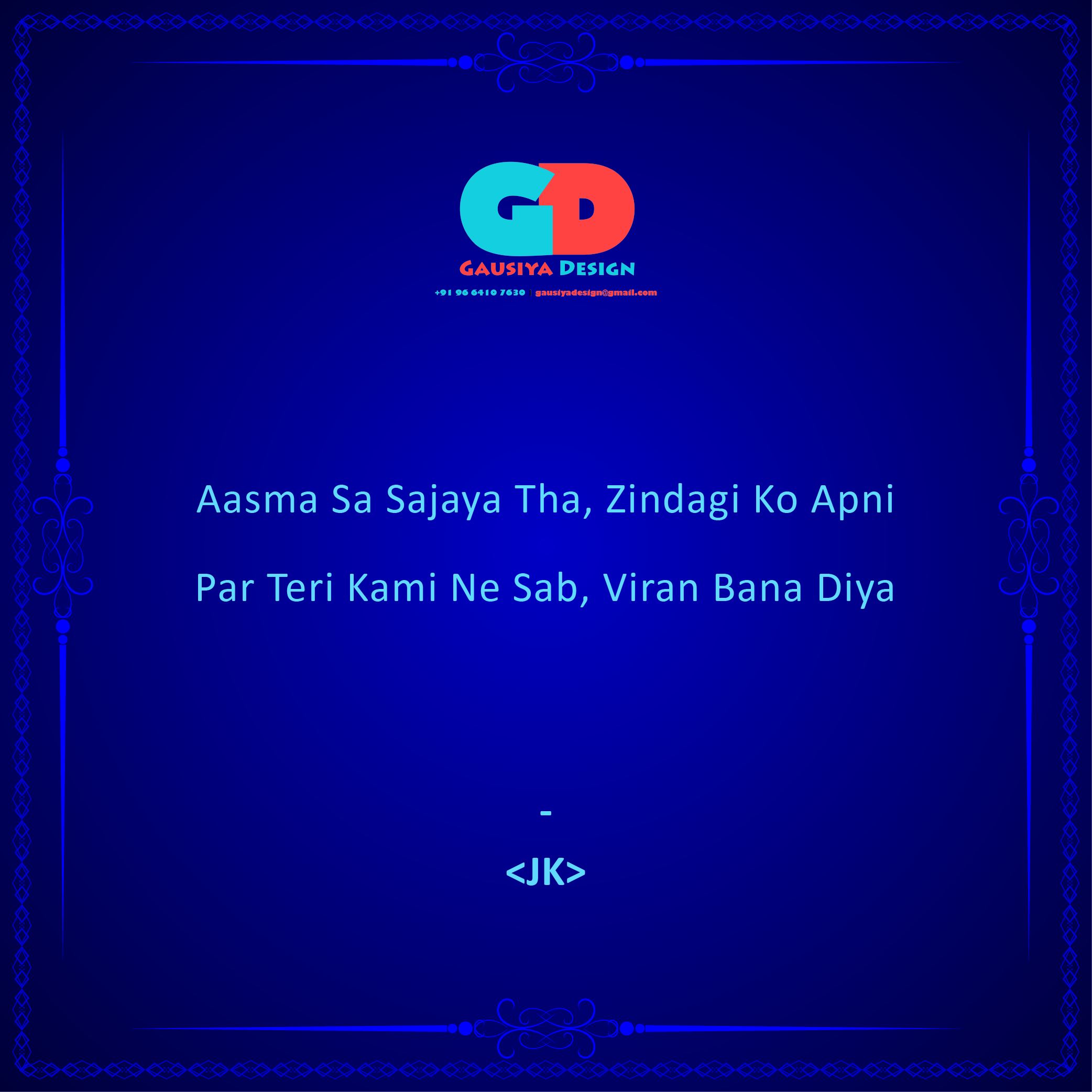 Zindagi ko Apni Posted byShayari by JKJanuary 29, 2020Posted inShayariTags:Gazal, Kavita, Motivational, Poem, Quotes, Share, Shayari, Speech Share this: Click to share on X (Opens in new window) X Click to share on Facebook (Opens in new window) Facebook Click to share on LinkedIn (Opens in new window) LinkedIn Click to share on Pinterest (Opens in new window) Pinterest Click to share on WhatsApp (Opens in new window) WhatsApp Like Loading... Related Published by Shayari by JK Immerse yourself in the world of Mystic SHAYARIS with JAFAR Ali Shaikh. View more posts