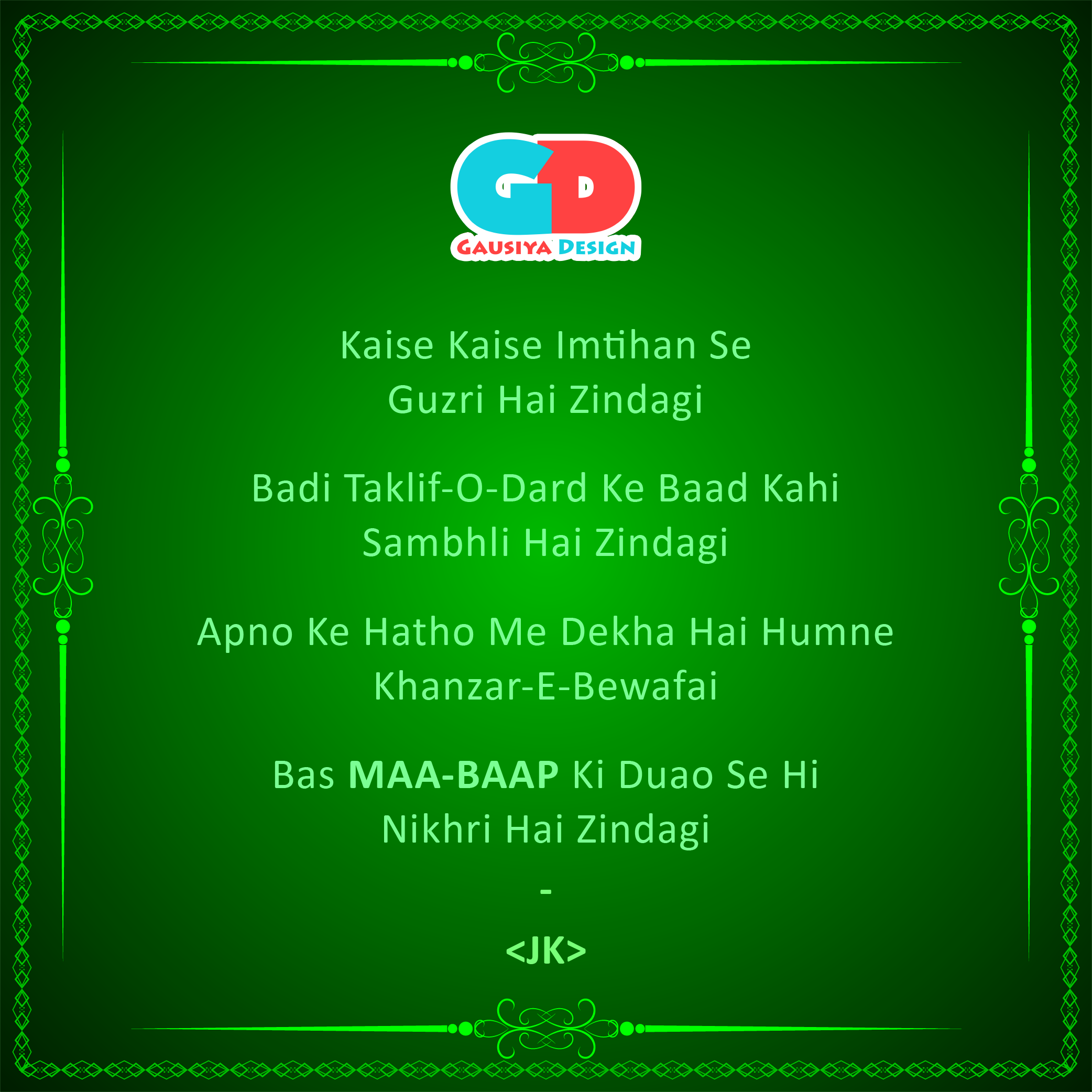 Maa Baap ki DUA Posted byShayari by JKFebruary 13, 2020Posted inShayariTags:father day, Gazal, Kavita, mothers day, Motivational, parents day, Poem, Quotes, Share, Shayari, Speech Share this: Click to share on X (Opens in new window) X Click to share on Facebook (Opens in new window) Facebook Click to share on LinkedIn (Opens in new window) LinkedIn Click to share on Pinterest (Opens in new window) Pinterest Click to share on WhatsApp (Opens in new window) WhatsApp Like Loading... Related Published by Shayari by JK Immerse yourself in the world of Mystic SHAYARIS with JAFAR Ali Shaikh. View more posts