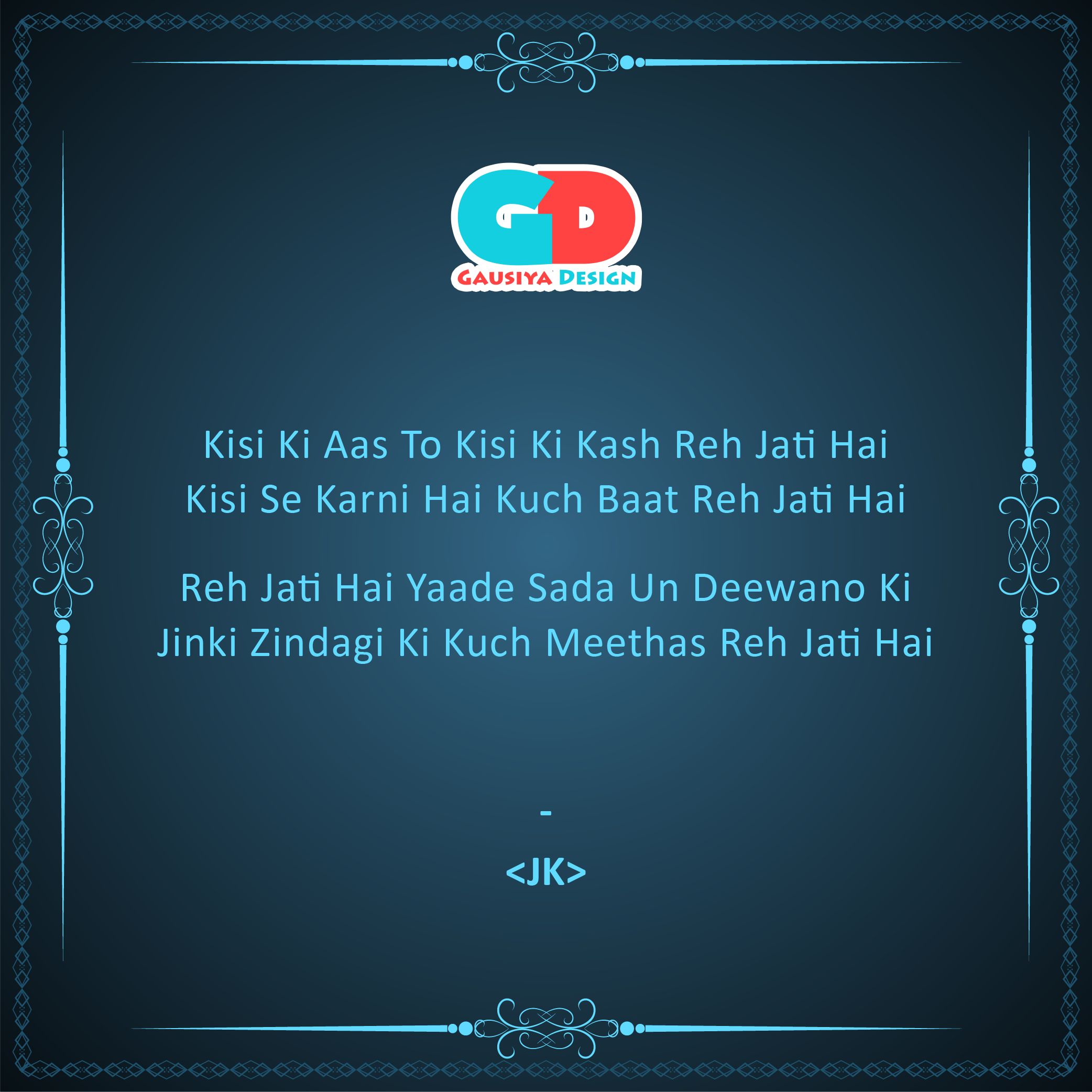 Reh Jati Hai Posted byShayari by JKMarch 12, 2020Posted inShayariTags:Gazal, Kavita, Motivational, Poem, Quotes, Share, Shayari, Speech Share this: Click to share on X (Opens in new window) X Click to share on Facebook (Opens in new window) Facebook Click to share on LinkedIn (Opens in new window) LinkedIn Click to share on Pinterest (Opens in new window) Pinterest Click to share on WhatsApp (Opens in new window) WhatsApp Like Loading... Related Published by Shayari by JK Immerse yourself in the world of Mystic SHAYARIS with JAFAR Ali Shaikh. View more posts