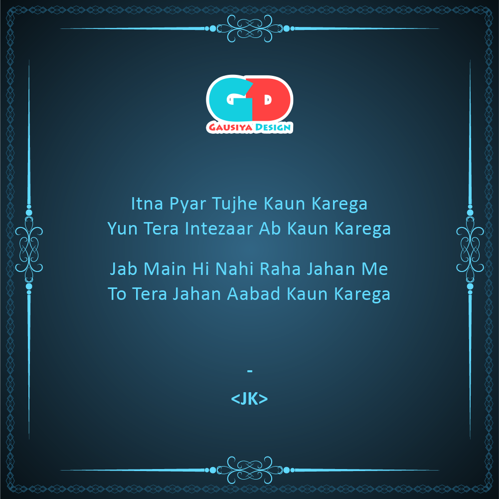 Kaun Karega? Posted byShayari by JKAugust 9, 2020Posted inShayariTags:Friend, Gazal, Kavita, Motivational, Poem, Quotes, Share, Shayari, Speech Share this: Click to share on X (Opens in new window) X Click to share on Facebook (Opens in new window) Facebook Click to share on LinkedIn (Opens in new window) LinkedIn Click to share on Pinterest (Opens in new window) Pinterest Click to share on WhatsApp (Opens in new window) WhatsApp Like Loading... Related Published by Shayari by JK Immerse yourself in the world of Mystic SHAYARIS with JAFAR Ali Shaikh. View more posts